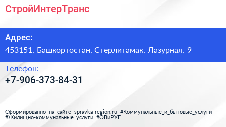 СтройИнтерТранс по адресу 453151, Башкортостан, Стерлитамак, Лазурная, 9 в дальнейшем Организация, размещена в следующих категориях: