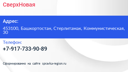 СверхНовая по адресу 453100, Башкортостан, Стерлитамак, Коммунистическая, 30 в дальнейшем Организация, размещена в следующих категориях: