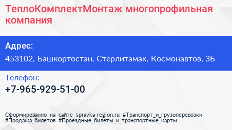 ТеплоКомплектМонтаж, многопрофильная компания по адресу 453102, Башкортостан, Стерлитамак, Космонавтов, 3Б в дальнейшем Организация, размещена в следующих категориях: