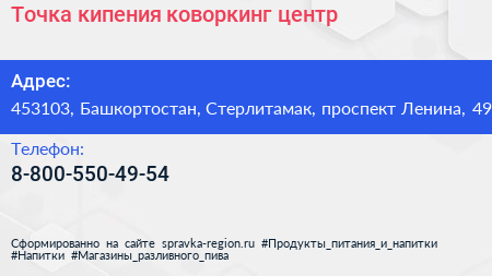 Точка кипения, коворкинг-центр по адресу 453103, Башкортостан, Стерлитамак, проспект Ленина, 49 в дальнейшем Организация, размещена в следующих категориях: