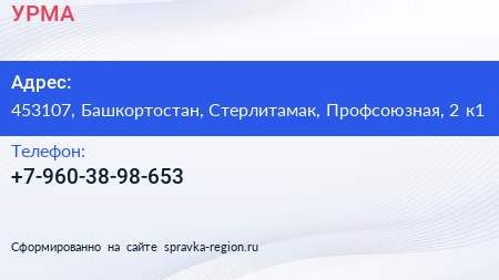 УРМА по адресу 453107, Башкортостан, Стерлитамак, Профсоюзная, 2 к1 в дальнейшем Организация, размещена в следующих категориях: