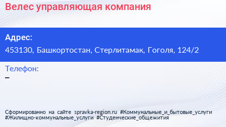 Велес, управляющая компания по адресу 453130, Башкортостан, Стерлитамак, Гоголя, 124/2 в дальнейшем Организация, размещена в следующих категориях:
