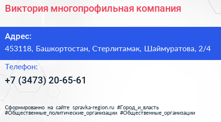Виктория, многопрофильная компания по адресу 453118, Башкортостан, Стерлитамак, Шаймуратова, 2/4 в дальнейшем Организация, размещена в следующих категориях: