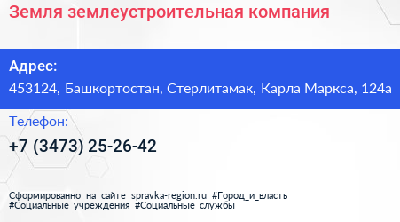 Земля, землеустроительная компания по адресу 453124, Башкортостан, Стерлитамак, Карла Маркса, 124а в дальнейшем Организация, размещена в следующих категориях: