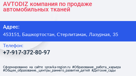 AVTODIZ, компания по продаже автомобильных тканей по адресу 453151, Башкортостан, Стерлитамак, Лазурная, 35 в дальнейшем Организация, размещена в следующих категориях:
