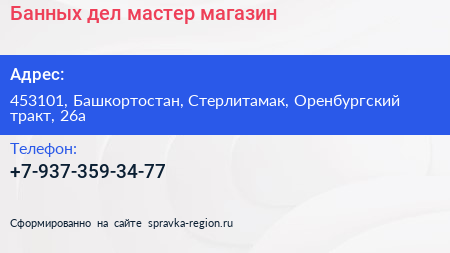 Банных дел мастер, магазин по адресу 453101, Башкортостан, Стерлитамак, Оренбургский тракт, 26а в дальнейшем Организация, размещена в следующих категориях: