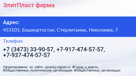 ЭлитПласт, фирма по адресу 453103, Башкортостан, Стерлитамак, Николаева, 7 в дальнейшем Организация, размещена в следующих категориях: