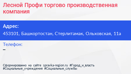 Лесной Профи, торгово-производственная компания по адресу 453101, Башкортостан, Стерлитамак, Ольховская, 11а в дальнейшем Организация, размещена в следующих категориях: