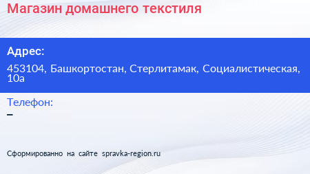 Магазин домашнего текстиля по адресу 453104, Башкортостан, Стерлитамак, Социалистическая, 10а в дальнейшем Организация, размещена в следующих категориях:
