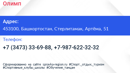 Олимп по адресу 453100, Башкортостан, Стерлитамак, Артёма, 51 в дальнейшем Организация, размещена в следующих категориях: