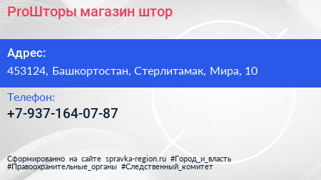 ProШторы, магазин штор по адресу 453124, Башкортостан, Стерлитамак, Мира, 10 в дальнейшем Организация, размещена в следующих категориях: