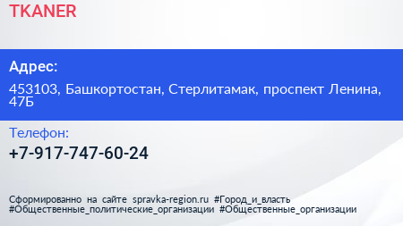 TKANER. по адресу 453103, Башкортостан, Стерлитамак, проспект Ленина, 47Б в дальнейшем Организация, размещена в следующих категориях: