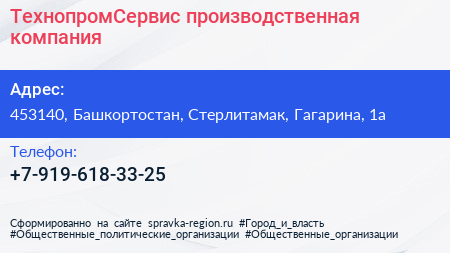 ТехнопромСервис, производственная компания по адресу 453140, Башкортостан, Стерлитамак, Гагарина, 1а в дальнейшем Организация, размещена в следующих категориях: