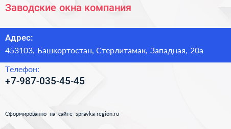Заводские окна, компания по адресу 453103, Башкортостан, Стерлитамак, Западная, 20а в дальнейшем Организация, размещена в следующих категориях: