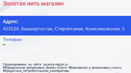 Золотая нить, магазин по адресу 453124, Башкортостан, Стерлитамак, Комсомольская, 5 в дальнейшем Организация, размещена в следующих категориях: