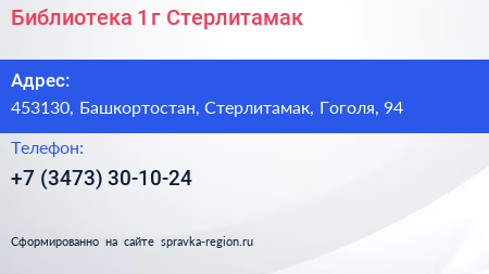Библиотека №1, г. Стерлитамак по адресу 453130, Башкортостан, Стерлитамак, Гоголя, 94 в дальнейшем Организация, размещена в следующих категориях: