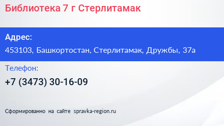 Библиотека №7, г. Стерлитамак по адресу 453103, Башкортостан, Стерлитамак, Дружбы, 37а в дальнейшем Организация, размещена в следующих категориях: