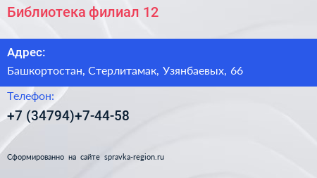 Библиотека-филиал №12 по адресу Башкортостан, Стерлитамак, Узянбаевых, 66 в дальнейшем Организация, размещена в следующих категориях: