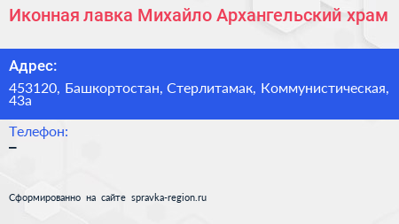 Иконная лавка, Михайло-Архангельский храм по адресу 453120, Башкортостан, Стерлитамак, Коммунистическая, 43а в дальнейшем Организация, размещена в следующих категориях: