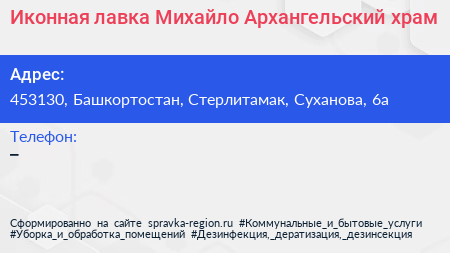 Иконная лавка, Михайло-Архангельский храм по адресу 453130, Башкортостан, Стерлитамак, Суханова, 6а в дальнейшем Организация, размещена в следующих категориях: