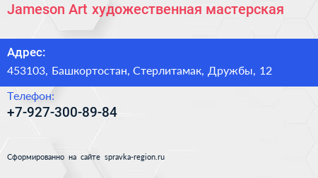Jameson Art, художественная мастерская по адресу 453103, Башкортостан, Стерлитамак, Дружбы, 12 в дальнейшем Организация, размещена в следующих категориях:
