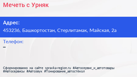 Мечеть, с. Урняк по адресу 453236, Башкортостан, Стерлитамак, Майская, 2а в дальнейшем Организация, размещена в следующих категориях: