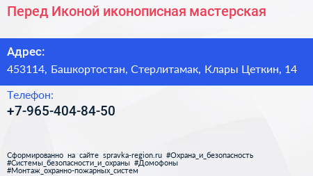 Перед Иконой, иконописная мастерская по адресу 453114, Башкортостан, Стерлитамак, Клары Цеткин, 14 в дальнейшем Организация, размещена в следующих категориях: