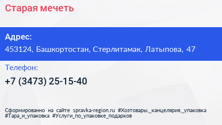 Старая мечеть по адресу 453124, Башкортостан, Стерлитамак, Латыпова, 47 в дальнейшем Организация, размещена в следующих категориях: