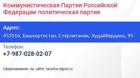 Коммунистическая Партия Российской Федерации, политическая партия по адресу 453116, Башкортостан, Стерлитамак, Худайбердина, 95 в дальнейшем Организация, размещена в следующих категориях: