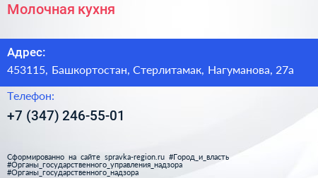 Молочная кухня по адресу 453115, Башкортостан, Стерлитамак, Нагуманова, 27а в дальнейшем Организация, размещена в следующих категориях: