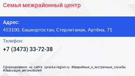 Семья, межрайонный центр по адресу 453100, Башкортостан, Стерлитамак, Артёма, 71 в дальнейшем Организация, размещена в следующих категориях:
