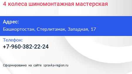 4 колеса, шиномонтажная мастерская по адресу Башкортостан, Стерлитамак, Западная, 17 в дальнейшем Организация, размещена в следующих категориях: