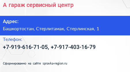 А-гараж, сервисный центр по адресу Башкортостан, Стерлитамак, Стерлинская, 1 в дальнейшем Организация, размещена в следующих категориях:
