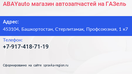 ABAYauto, магазин автозапчастей на ГАЗель по адресу 453104, Башкортостан, Стерлитамак, Профсоюзная, 1 к7 в дальнейшем Организация, размещена в следующих категориях: