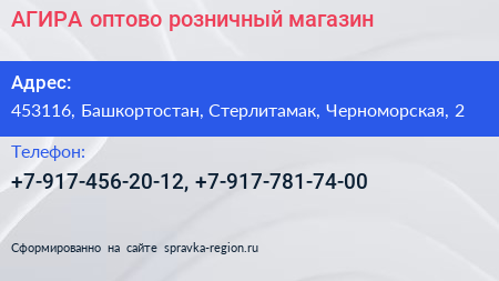 АГИРА, оптово-розничный магазин по адресу 453116, Башкортостан, Стерлитамак, Черноморская, 2 в дальнейшем Организация, размещена в следующих категориях:
