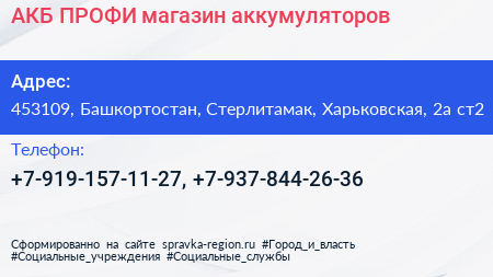 АКБ ПРОФИ, магазин аккумуляторов по адресу 453109, Башкортостан, Стерлитамак, Харьковская, 2а ст2 в дальнейшем Организация, размещена в следующих категориях: