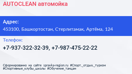 AUTOCLEAN, автомойка по адресу 453100, Башкортостан, Стерлитамак, Артёма, 124 в дальнейшем Организация, размещена в следующих категориях: