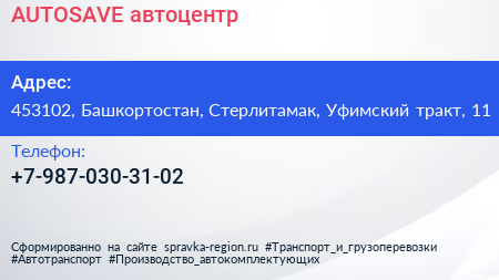 AUTOSAVE, автоцентр по адресу 453102, Башкортостан, Стерлитамак, Уфимский тракт, 11 в дальнейшем Организация, размещена в следующих категориях: