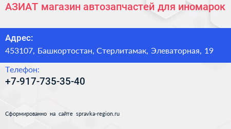 АЗИАТ, магазин автозапчастей для иномарок по адресу 453107, Башкортостан, Стерлитамак, Элеваторная, 19 в дальнейшем Организация, размещена в следующих категориях: