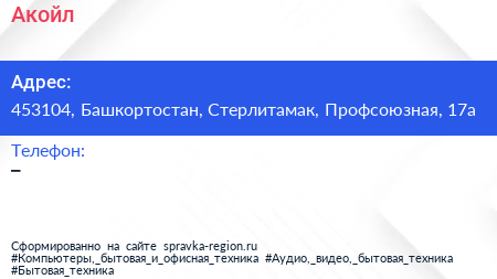 Акойл по адресу 453104, Башкортостан, Стерлитамак, Профсоюзная, 17а в дальнейшем Организация, размещена в следующих категориях: