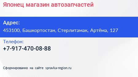 Японец, магазин автозапчастей по адресу 453100, Башкортостан, Стерлитамак, Артёма, 127 в дальнейшем Организация, размещена в следующих категориях: