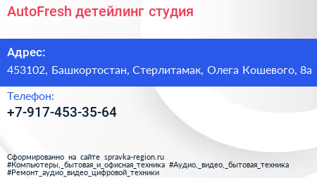 AutoFresh, детейлинг-студия по адресу 453102, Башкортостан, Стерлитамак, Олега Кошевого, 8а в дальнейшем Организация, размещена в следующих категориях: