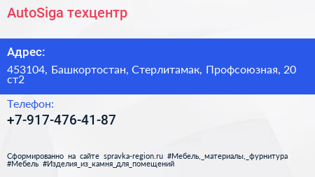 AutoSiga, техцентр по адресу 453104, Башкортостан, Стерлитамак, Профсоюзная, 20 ст2 в дальнейшем Организация, размещена в следующих категориях: