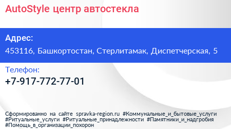 AutoStyle, центр автостекла по адресу 453116, Башкортостан, Стерлитамак, Диспетчерская, 5 в дальнейшем Организация, размещена в следующих категориях:
