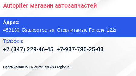 Autopiter, магазин автозапчастей по адресу 453130, Башкортостан, Стерлитамак, Гоголя, 122г в дальнейшем Организация, размещена в следующих категориях: