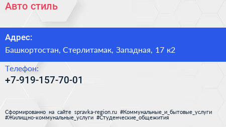 Авто стиль по адресу Башкортостан, Стерлитамак, Западная, 17 к2 в дальнейшем Организация, размещена в следующих категориях: