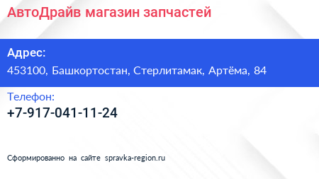 АвтоДрайв, магазин запчастей по адресу 453100, Башкортостан, Стерлитамак, Артёма, 84 в дальнейшем Организация, размещена в следующих категориях: