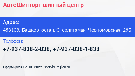 АвтоШинторг, шинный центр по адресу 453109, Башкортостан, Стерлитамак, Черноморская, 29Б в дальнейшем Организация, размещена в следующих категориях: