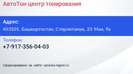 АвтоТон, центр тонирования по адресу 453101, Башкортостан, Стерлитамак, 23 Мая, 9а в дальнейшем Организация, размещена в следующих категориях: