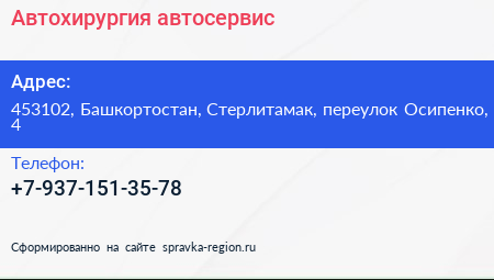 Автохирургия, автосервис по адресу 453102, Башкортостан, Стерлитамак, переулок Осипенко, 4 в дальнейшем Организация, размещена в следующих категориях: